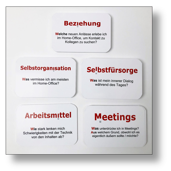 Dieses Tool soll die Eigenwahrnehmung im Home-Office für sich selbst erhöhen. So können die eigenen Erfahrungen bewusster reflektiert und das eigene Verhalten optimiert werden. Daher gibt es erst einmal nicht ‚richtig‘ oder ‚falsch‘, sondern nur Erkenntnisse für sich selbst. Allein durch diese konstruktive Selbstreflexion können sich schon erste Veränderungen einstellen.